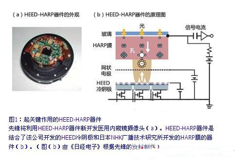 先鋒打算通過在內(nèi)窺鏡攝像頭中采用“HEED-HARP”技術(shù),以實(shí)現(xiàn)與其他公司產(chǎn)品的大幅差異化(圖1)。HEED-HARP結(jié)合了該公司開發(fā)的冷陰極型平面電子源“HEED”(highefficiency electron emission device)和日本NHK廣播技術(shù)研究所主導(dǎo)開發(fā)的超高靈敏度光電轉(zhuǎn)換膜“HARP”(high-gain avalanche rushing amorphous photoconductor)。