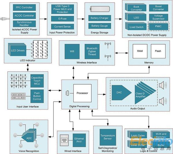 由于這些音箱通常放置在床頭柜或書(shū)桌上,交流電源可輕松獲得,因此電池電源并非是必不可少的。但是,考慮到這些音箱的位置,增加電池充電功能則具有重要意義,可以通過(guò)USB或無(wú)線(xiàn)方式為智能手機(jī)和智能手表充電。最后,消費(fèi)者需要可以在這些位置連接并控制燈光、恒溫器和安防系統(tǒng)。