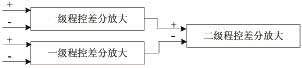 程控放大器是在DSP的控制下,將初級放大的信號放大到ADC的轉(zhuǎn)化區(qū)間內(nèi),以提高儀器的動態(tài)范圍和靈敏度??紤]到器件的低頻噪聲特性和提高共模抑制比等因素,選擇了PGA204、PGA205組合,其共模抑制最高可達120dB.本設(shè)計采用了兩級程控反向差分的方法,并且兩級程控放大采用直接耦合差動連接的方式。原理如圖3示。