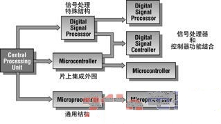 數(shù)字信號(hào)控制器(DSC)已開(kāi)始在處理許多以往需由微控制器(MCU)和數(shù)字信號(hào)處理器(DSP)共同完成的復(fù)雜問(wèn)題上嶄露頭角。作為這兩種器件的一種混合,DSC隨時(shí)準(zhǔn)備加入它們的行列(見(jiàn)圖1)并將與其共存。