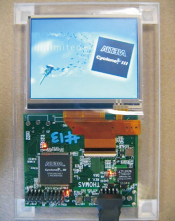 LCD正在迅速成為汽車(chē)內(nèi)的標(biāo)準(zhǔn)部件。隨著LCD技術(shù)的發(fā)展,迫切需要采用更好的顯示圖形內(nèi)容控制和產(chǎn)生方法。傳統(tǒng)上,低成本汽車(chē)信息娛樂(lè)應(yīng)用采用基于字符的LCD和真空熒光(VF)顯示屏,而低成本彩色薄膜晶體管(TFT)技術(shù)很快成為最突出的選擇方案,但在現(xiàn)有的低成本應(yīng)用體系結(jié)構(gòu)中采用彩色TFT有很大的難度。大部分低成本平臺(tái)沒(méi)有足夠的處理帶寬,特別是缺少帶有LCD控制器的處理器來(lái)控制并驅(qū)動(dòng)彩色TFT LCD。此外,大部分現(xiàn)有的體系結(jié)構(gòu)并沒(méi)有足夠的動(dòng)態(tài)和非易失存儲(chǔ)器來(lái)存儲(chǔ)LCD需要的圖形內(nèi)容。更復(fù)雜的設(shè)計(jì)問(wèn)題是產(chǎn)生并管理圖形內(nèi)容或者圖形用戶界面(GUI)時(shí)低效的設(shè)計(jì)過(guò)程,而現(xiàn)在可以通過(guò)彩色TFT LCD來(lái)解決這些問(wèn)題。一般而言,如果沒(méi)有合適的設(shè)計(jì)資源,很難在硬件上實(shí)現(xiàn)LED背光驅(qū)動(dòng)器、觸摸面板控制以及TFT控制所需要的大量I/O,現(xiàn)在這些難題有了解決方法,即,名為T(mén)homas II電路板(圖1)的模塊化擴(kuò)展平臺(tái),它含有低成本Altera Cyclone III FPGA和Nios II嵌入式處理器。使用這一平臺(tái),汽車(chē)電子設(shè)計(jì)人員很容易在現(xiàn)有系統(tǒng)體系結(jié)構(gòu)中加入彩色TFT,開(kāi)發(fā)低成本智能顯示模塊。