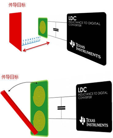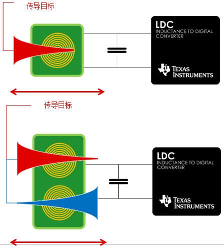 LDC也可以用來(lái)測(cè)量目標(biāo)物體橫向運(yùn)動(dòng)的狀況。如下圖所示,當(dāng)一個(gè)楔形金屬目標(biāo)掠過(guò)傳感線圈時(shí),渦流損耗的變化便被記錄下來(lái)。如果采用兩個(gè)傳感線圈,那么目標(biāo)物體與探測(cè)線圈之間距離的抖動(dòng)誤差就可以通過(guò)差分的形式加以消除。