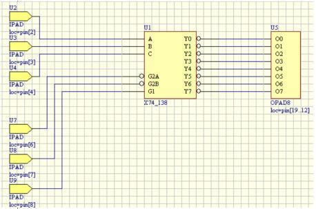 圖1畫好的PLD原理圖這是一個(gè)3-8譯碼器的PLD文件。輸入信號(hào)為目標(biāo)元件的2、3、4三個(gè)腳,輸出信號(hào)為目標(biāo)元件的12-19腳,6-8腳為使能控制端。