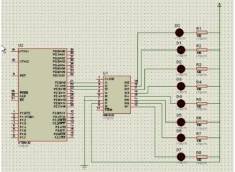 將單片機(jī)的程序加入AT89C52后,在Proteus中點(diǎn)擊Play鍵觀看電路仿真結(jié)果:當(dāng)輸入端的I1、I2、I3值按程序設(shè)定按真值表中的000—111依附改變時(shí),輸出端對(duì)應(yīng)LED燈按真值表中的對(duì)應(yīng)關(guān)系由IO0至IO7依次點(diǎn)亮,如下圖。說(shuō)明PLD器件16V8設(shè)計(jì)的三八譯碼器譯碼正確。