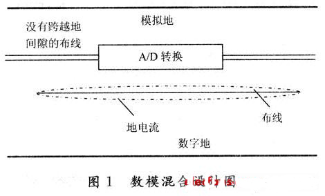 系統(tǒng)僅有一個(gè)A/D轉(zhuǎn)換器,采用混合信號(hào)PCB的分區(qū)設(shè)計(jì),即使用同一地,如圖1所示。將PCB分區(qū)為模擬部分和數(shù)字部分,在A/D器件的下面把模擬地和數(shù)字地部分連接在一起。保證兩個(gè)地之間的連接橋?qū)挾扰cIC等寬,所有信號(hào)線一般都不能跨越分割間隙,跨越分割間隙的信號(hào)線要位于緊鄰大面積地的布線層上。電路板的所有層中數(shù)字信號(hào)只能在電路板的數(shù)字部分布線,模擬信號(hào)只能在電路板的模擬部分布線,模擬和數(shù)字電源分開。
