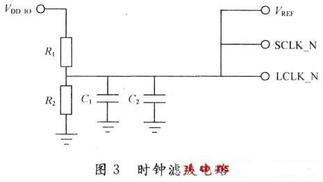 TS10l內(nèi)核時(shí)鐘最高可以是輸入時(shí)鐘的6倍。內(nèi)核時(shí)鐘最高只能工作在250/300 MHz,系統(tǒng)時(shí)鐘SCLK輸入范圍為40~100 MHz。為確保時(shí)鐘的穩(wěn)定性,增加專門的濾波電路,如圖3所示。其中,R1△2 kΩ,R2△1.67 kΩ,C1△1μF(SMD),C2△1 000 pF(HF SMD),并應(yīng)貼近DSP引腳放置。該電路同時(shí)為參考電壓輸出、系統(tǒng)時(shí)鐘和局部參考時(shí)鐘提供了參考電壓,電壓值為1.5 V±100 mV。