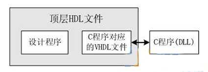 仿真文件的構(gòu)成如圖3所示,包括HDL文件和動態(tài)鏈接庫(即C程序)。圖中C程序?qū)?yīng)的VHDL文件要負(fù)責(zé)聲明對應(yīng)的動態(tài)連接庫文件名及初始化函數(shù),另外還可以給出一些調(diào)用參數(shù)。動態(tài)鏈接庫中用到的輸入輸出信號也要在對應(yīng)的VHDL文件中聲明。